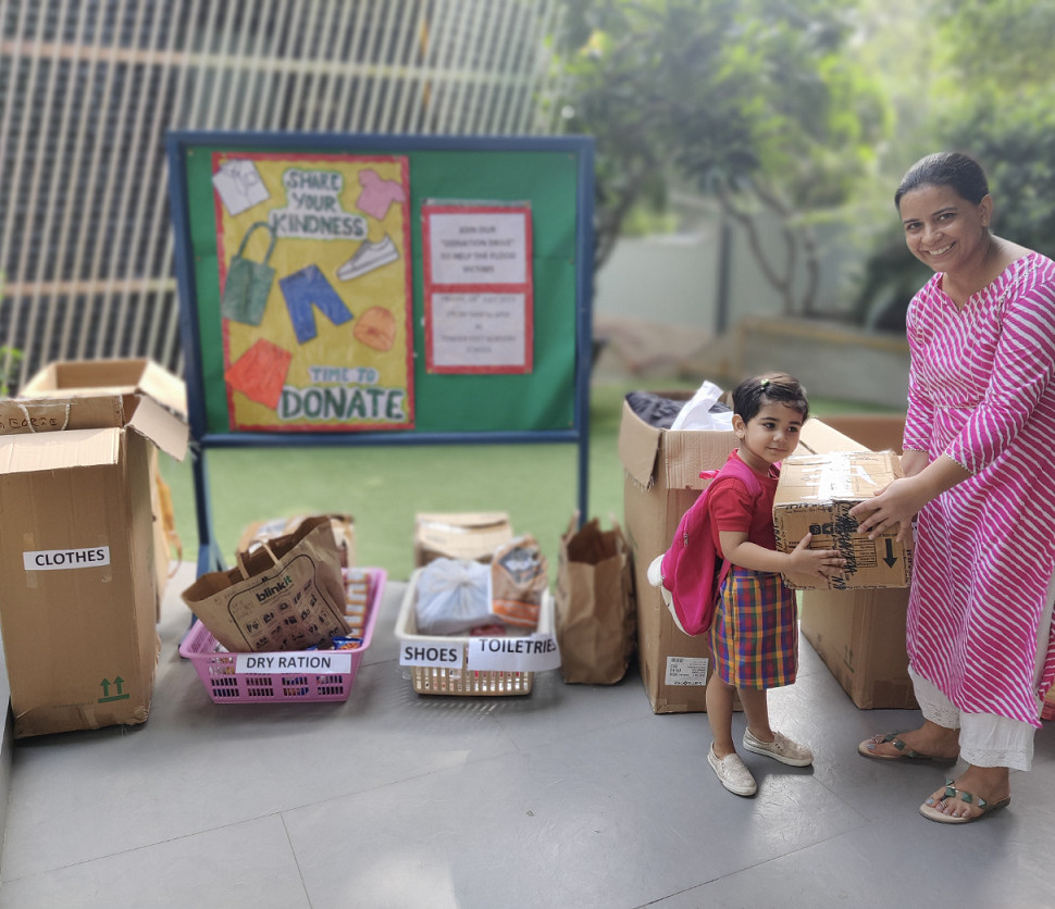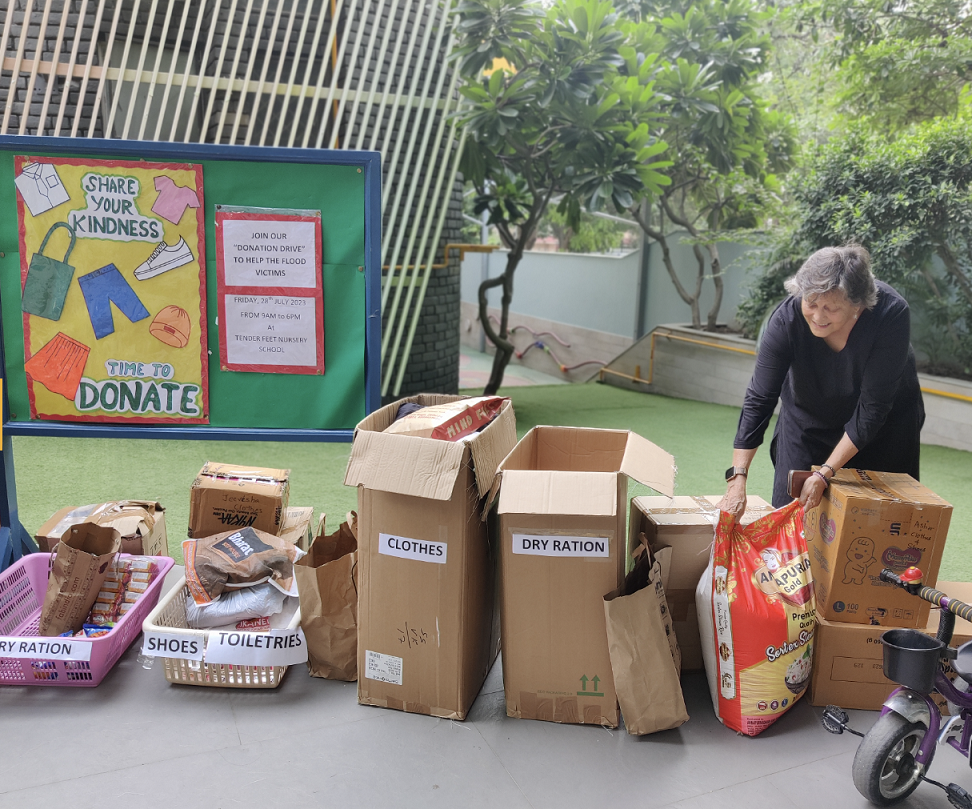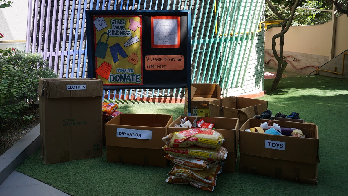 Tender Feet Nursery School hosts a biannual Donation Drive. Our parents have always been very generous and participate wholeheartedly. We extend our heartfelt gratitude to them, whose remarkable generosity has made this initiative possible. The contribution always comes in the form of old clothes, toys, blankets, winter wear, ration, and much more .The outpour of support is truly heartwarming, and it has made a real difference in the lives of those in need.These drives not only provide the much-needed help to families facing tough times but also serve as an important teaching moment for our young learners. Through these acts of kindness, we nurture values of compassion, empathy, and social responsibility.This initiative is a hands-on lesson in kindness, teamwork, and social responsibility.